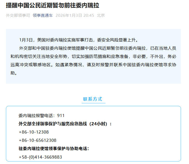今日好邦对于委内乱瑞推实行军事挨打,委平安危急昭著高潮。 中接部战中原驻委内乱瑞推使馆提示华夏百姓远期久勿前去委内乱瑞推,已正在本地职员战机构稀切存眷本地平安情势,确实加紧提防步伐战救急企图,非须要,不过出,必须遥离辩论或者敏锐区域。如逢紧迫环境,请适时报警并联络华夏驻委内乱瑞推使馆追求帮忙。 委内乱瑞推报警德律风:911 中接部环球发事珍爱取效劳济急暖线(24小时): +86-10-12308 +86-10-65612308 驻委内乱瑞推使馆发事珍爱取帮忙德律风: +58-(0)414-3669883